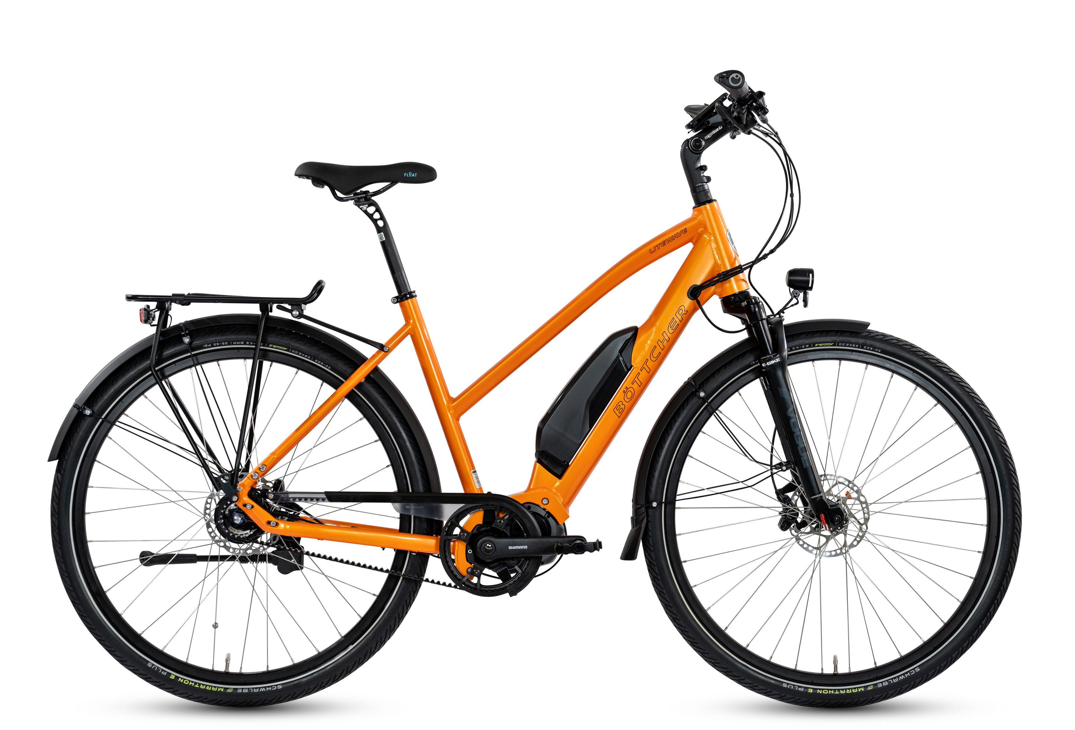 Der Shimano Steps-Mittelmotor sorgt für ein kräftiges Anziehen im flachen sowie im hügeligen Gelände. Im Standard fährt das Böttcher Litewave Sport 6100 dem großen 504 Wh Akku von Shimano Steps. Die Shimano Schaltung schaltet schnell und einfach und harmoniert perfekt mit dem Motor. Dank der Schaltungsautomatik (bei Di2 Schaltung) braucht man sich nicht um den richtigen Gang kümmern. Im Automatikmodus entscheidet sich der Motor schnell für den richtigen Gang. Wer nicht abwarten kann bis der Motor schaltet, kann natürlich weiterhin manuell den Gang einstellen. Der Motor merkt sich dieses Eingreifen und wird bei einer ähnlichen Situation in Zukunft entsprechend früher schalten. Die Shimano DISC-Bremse garantiert Ihnen einen präzisen Fahrspaß. Mit dem bis zu 130 kg belastbaren Aluminiumrahmen und dem bis zu 30 kg belastbaren Gepäckträger, hält unser Litewave auch höheren Belastungen stand. Trotz des stabilen Rahmens verliert das Fahrrad jedoch nicht an Wendigkeit. Die angenehme Lenkerführung wird von den ergonomisch geformten Griffen unterstützt. Das Böttcher Litewave Sport wird Sie überzeugen.